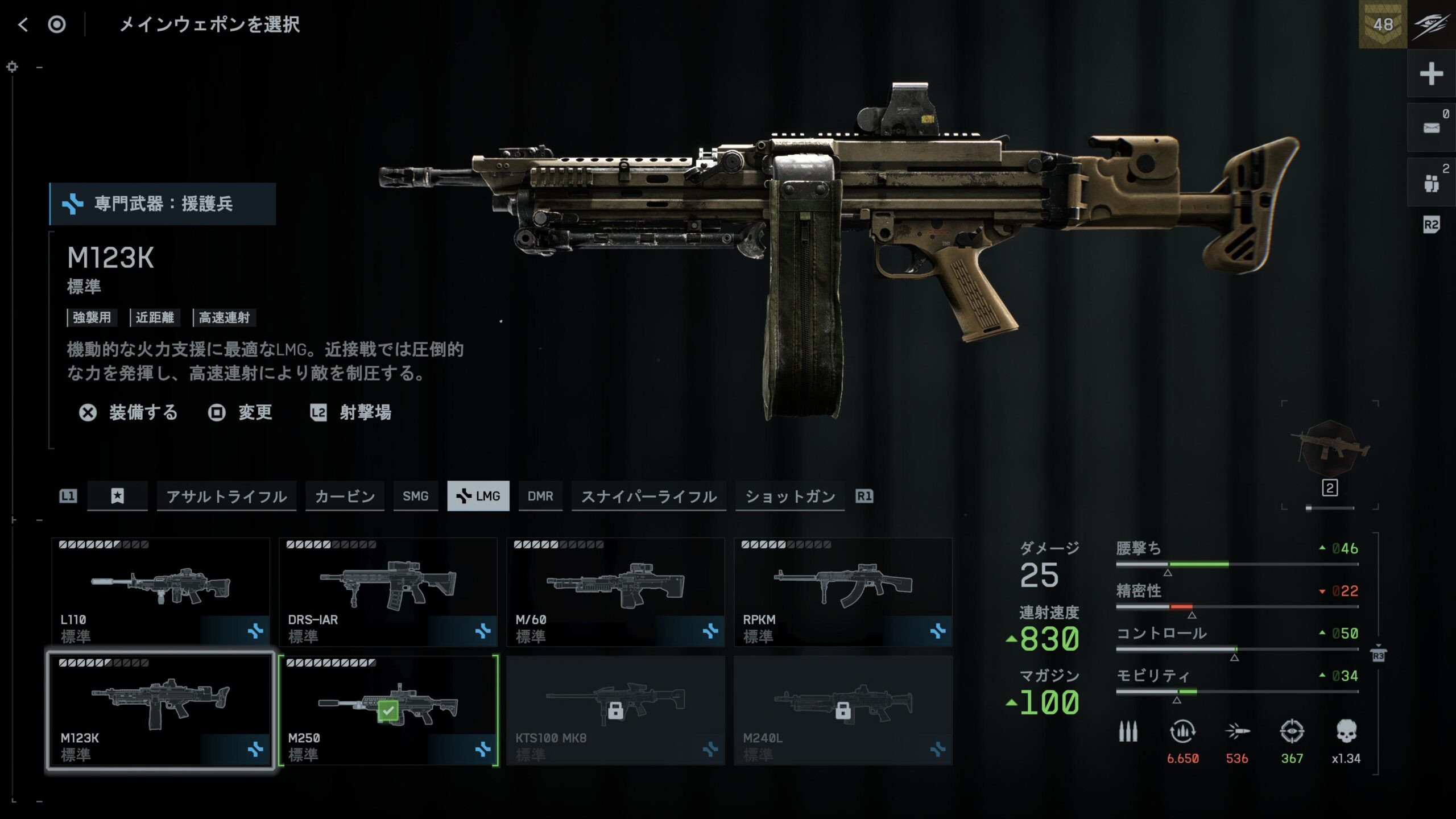 中距離くらいで大量の弾を高レートでバラまきたいならM123Kだし、中遠距離でバイポッド使って敵を狙撃したいならM250だし