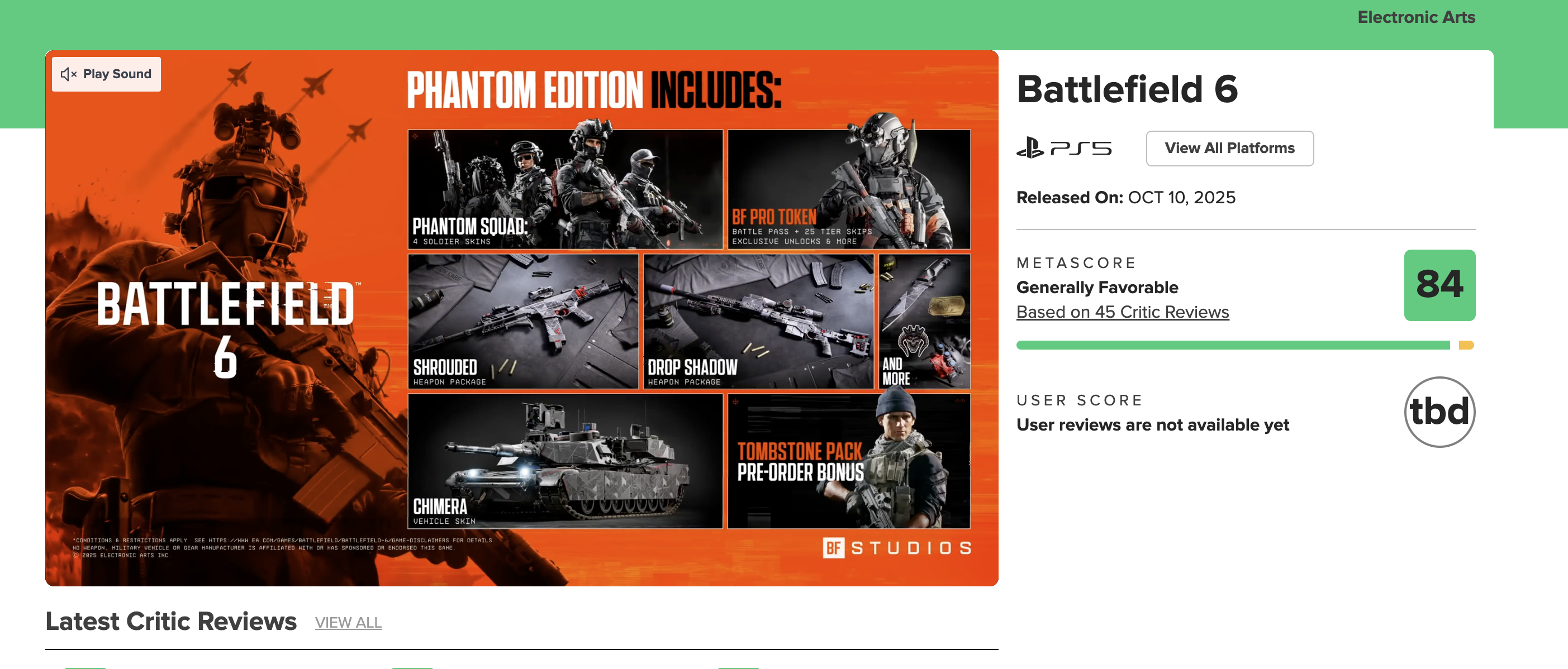 『Battlefield 6』メタスコア84点!海外メディアの評価一覧。