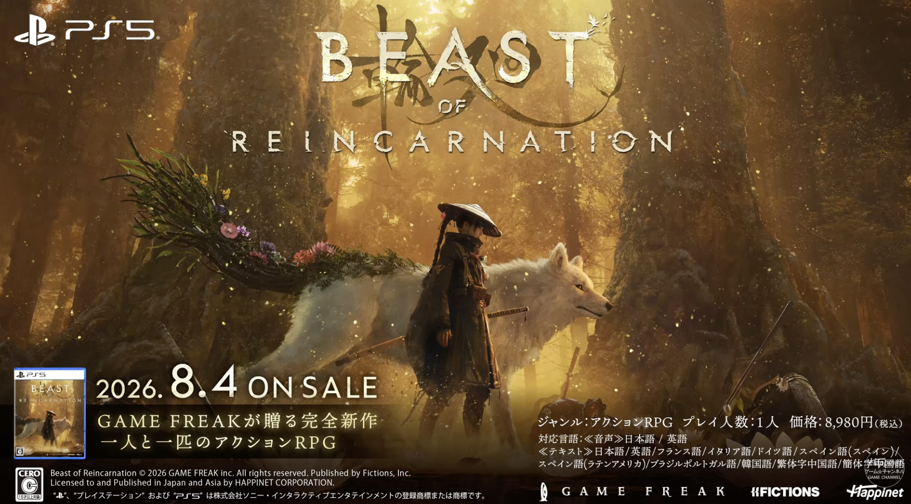ハピネットは2026年4月20日、ゲームフリークが開発する完全新作アクションRPG『ビースト・オブ・リンカネーション』(Beast of Reincarnation)のPlayStation 5 パッケージ版を、2026年8月4日(火)に発売すると発表しました。本日より全国のゲーム取扱店およびオンラインショップで予約受付が開始されています。