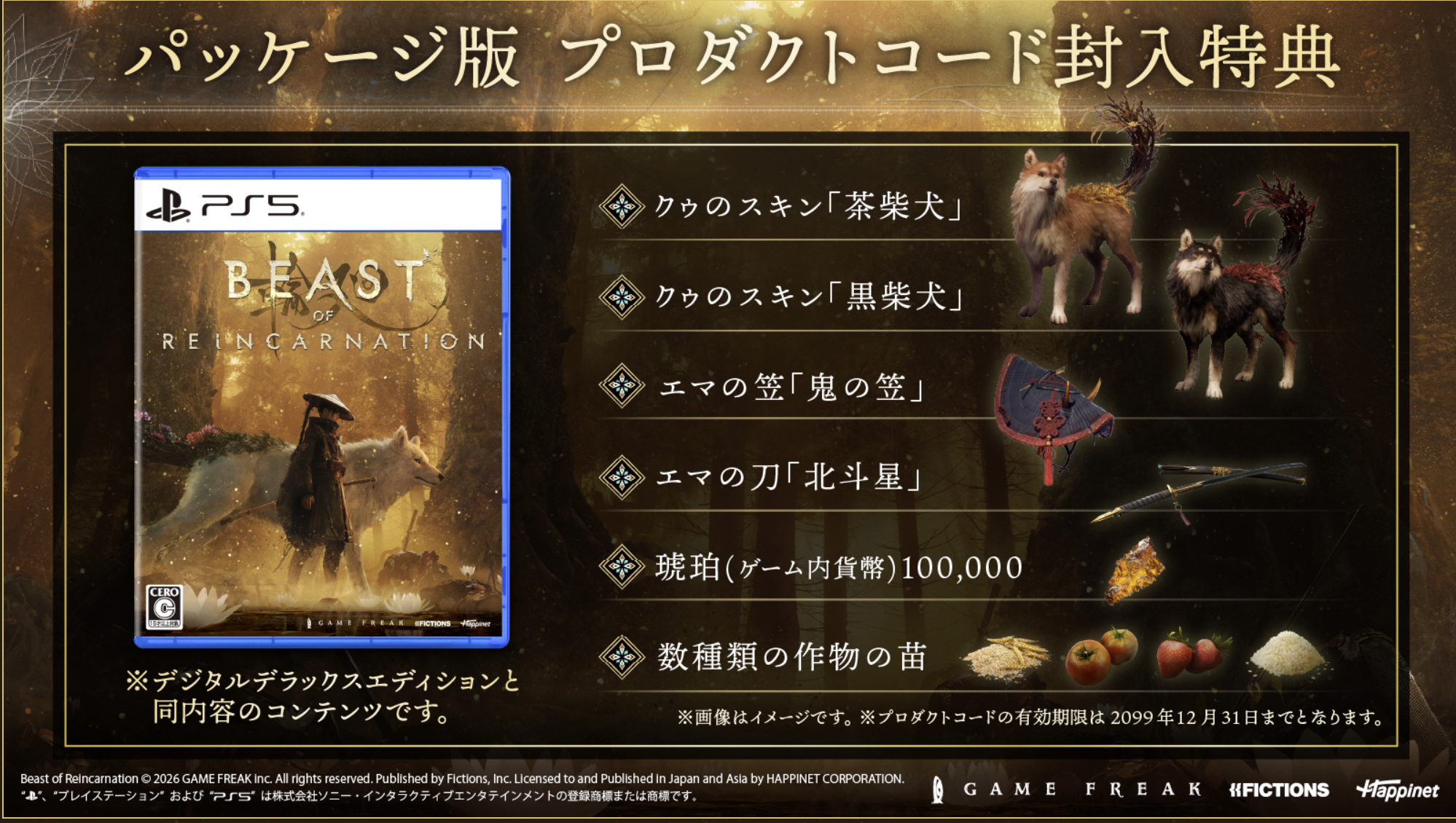 価格は8,980円(税込)。パッケージ版には、デジタルデラックスエディション相当の特典として、クゥの「茶柴犬」「黒柴犬」スキンや、エマの刀「北斗星」などの追加コンテンツがダウンロード可能なプロダクトコードが封入されます。店舗特典は後日公開予定。