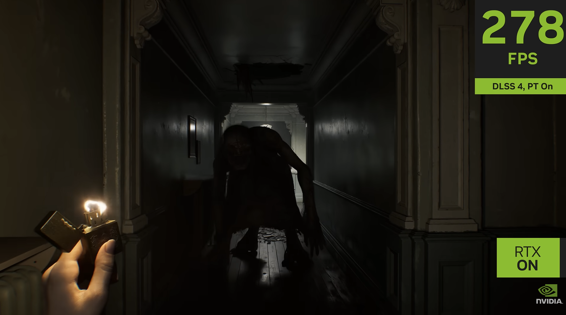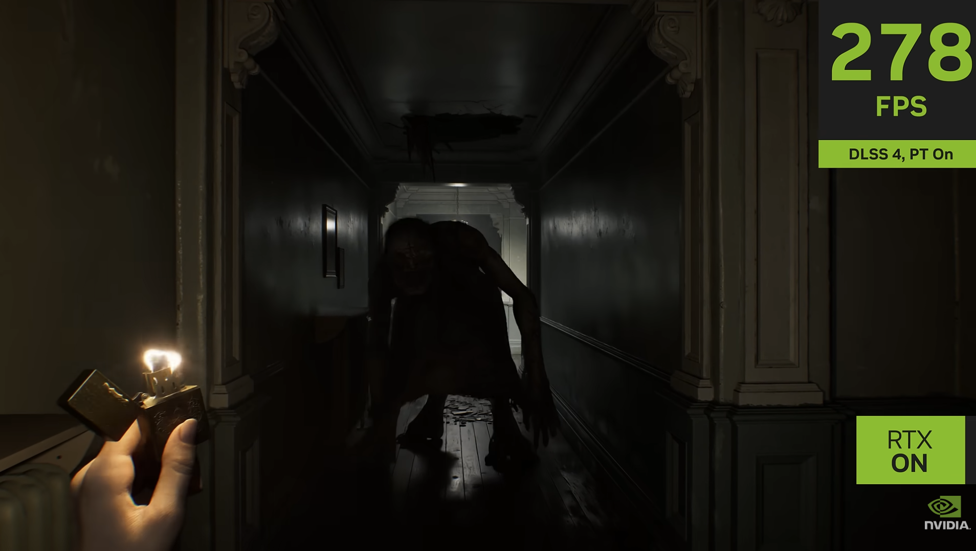 公開された映像では、リアルタイムで計算される光と影の表現が強調され、暗闇に包まれた空間や不穏な室内シーンにおいて、従来作を大きく上回る没入感を演出している。パストレーシングの導入により、反射光や間接照明がより自然に描写され、恐怖演出そのものが進化している点が非常に印象的。