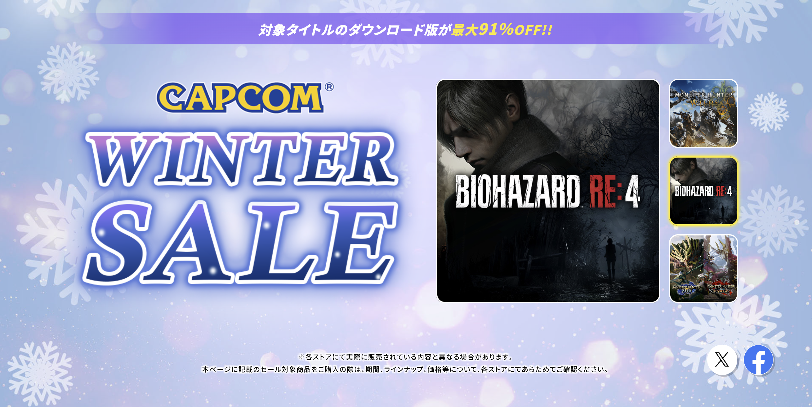 「CAPCOM WINTER SALE」開催中!PS5版 バイオヴィレッジ 998円、RE:2/RE:3 997円、RE:4 1,996円。
