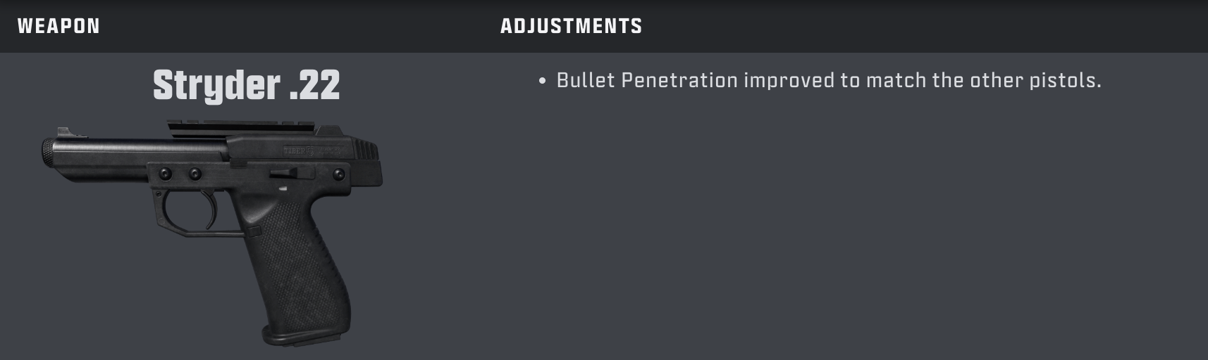最後に、弾丸の貫通度合を大幅に調整します。これまでに、弾丸が過剰に障害物を貫通するケースが確認されており、まずはすべての素材における最大貫通深度を減少させることで対応します。さらに直感的で一貫性のある弾丸貫通を実現するため、長期的な計画として今後のアップデートでさらなる改善を導入する予定です。