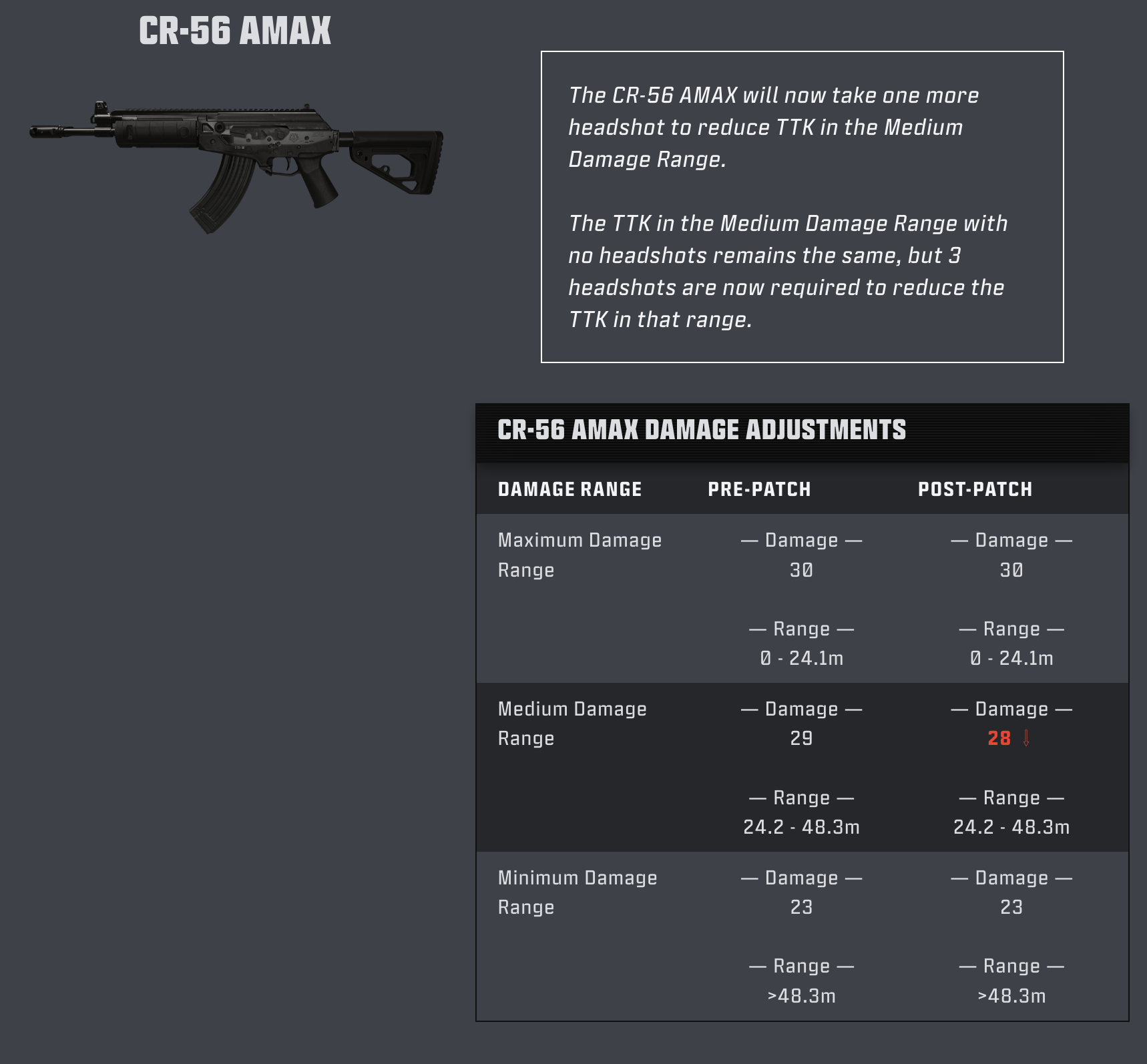 CR-56 AMAXは、中距離ダメージ範囲でのTTKを短縮するには、これまでよりヘッドショットが1発多く必要になります。