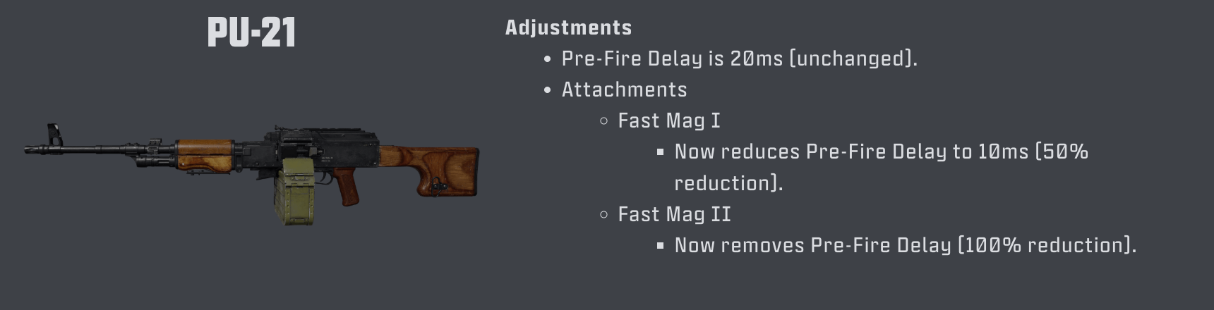 LMGの「ファストマグ」アタッチメントは、プレ・ファイア遅延を短縮するようになり、このクラスの制限を緩和しようとするビルドの反応速度を向上させます。