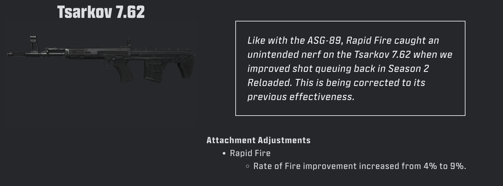 ASG-89と同様に、シーズン2リローデッドでショットキューイングの改善を行った際に、Tsarkov 7.62のラピッドファイアが意図せず弱体化しました。これを以前の効果に修正します。
