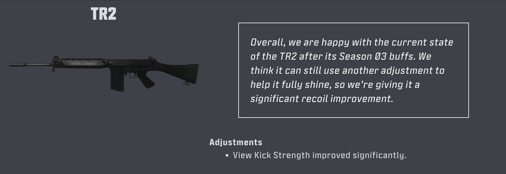 全体的に、TR2はシーズン03のバフ後の状態に満足していますが、さらに輝きを引き出すためにもう一度調整が必要だと考えています。そのため、反動の大幅な改善を行います。