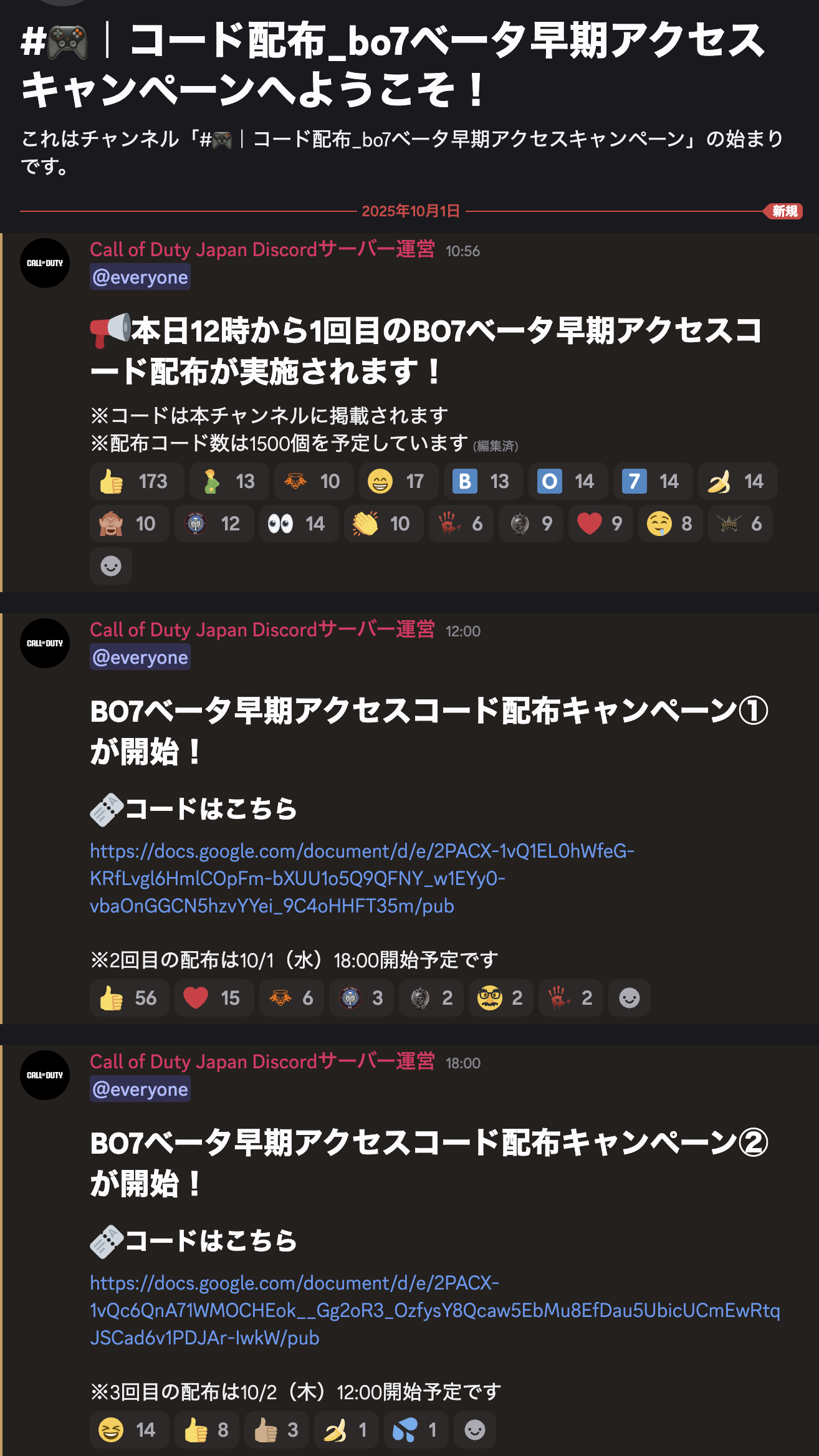 10月3日からオープンベータ先行アクセスが開催されますが、その際に必要なアクセスコードを配布するキャンペーンがCoD公式ディスコード内で行われておりますので入手方法をご紹介致します。ちなみに初回は10月1日の12時〜、2回目は18時から実施され、相当数のアクセスコードが配布されました。まだ入手してない方は是非今回のキャンペーンをご利用ください。