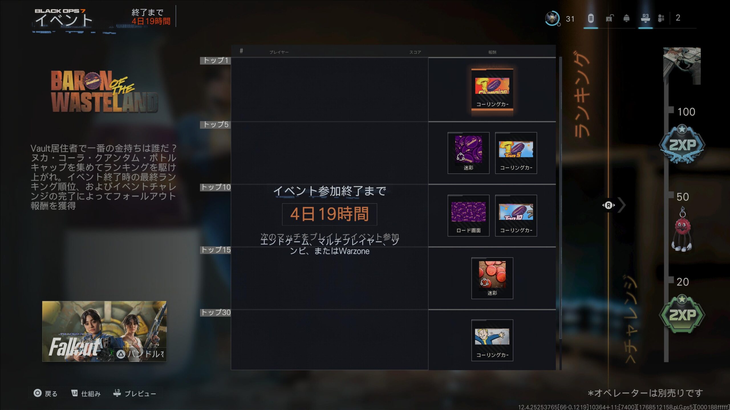 ヌカ・コーラ・クアンタム・ボトルを集めてランキングを駆け上がれ。イベント終了時の最終ランキング順位、及びイベントチャレンジ完了によってフォールアウト報酬を獲得。