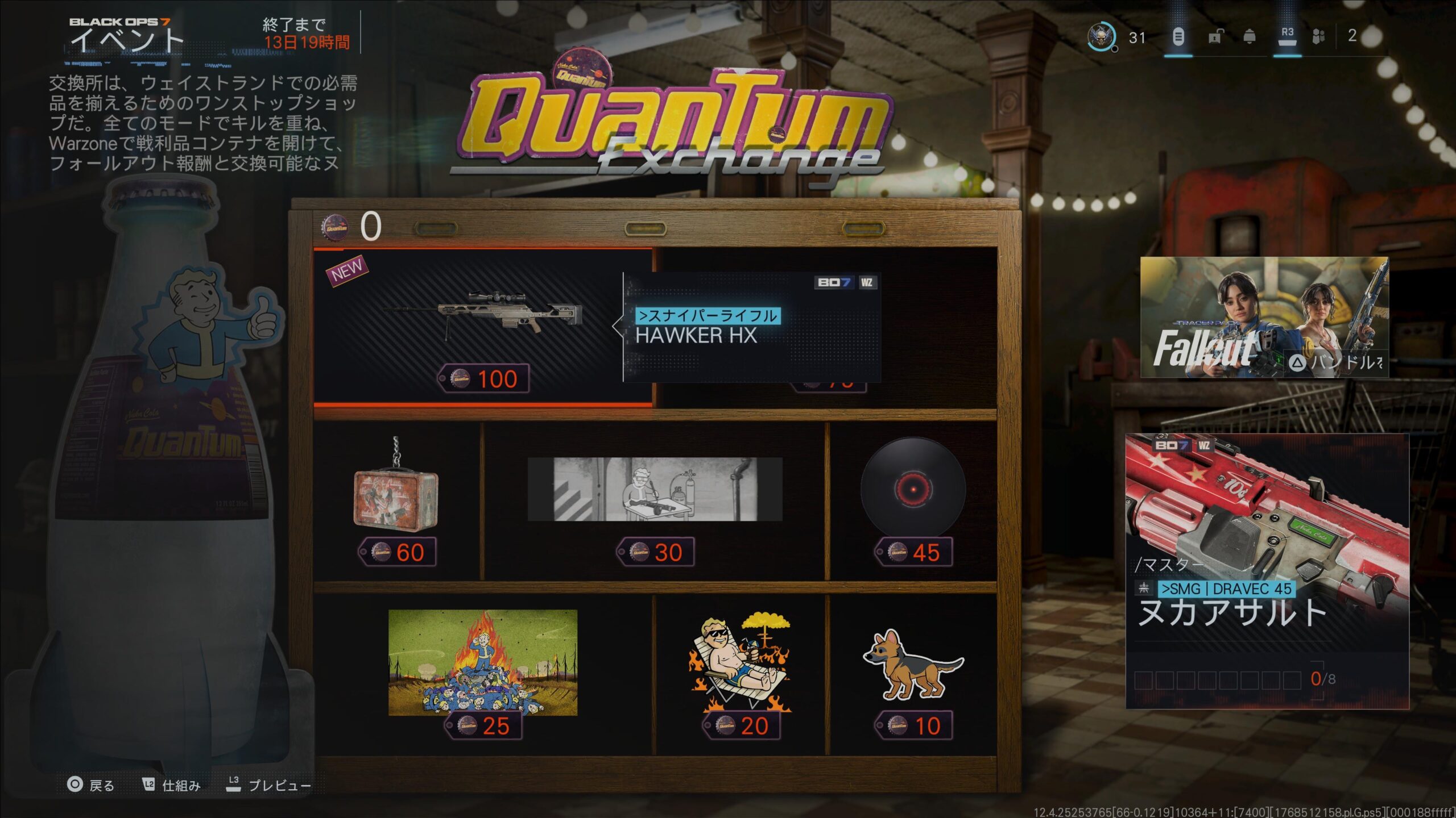 交換所は、ウェイストランドでの必需品を揃えるためのワンストップショップだ。全てのモードでキルを重ね、WARZONEで戦利品コンテナを開けて、フォールアウト報酬と交換可能なヌカ・コーラ・クアンタム・ボトルを集めるチャンスを掴め。