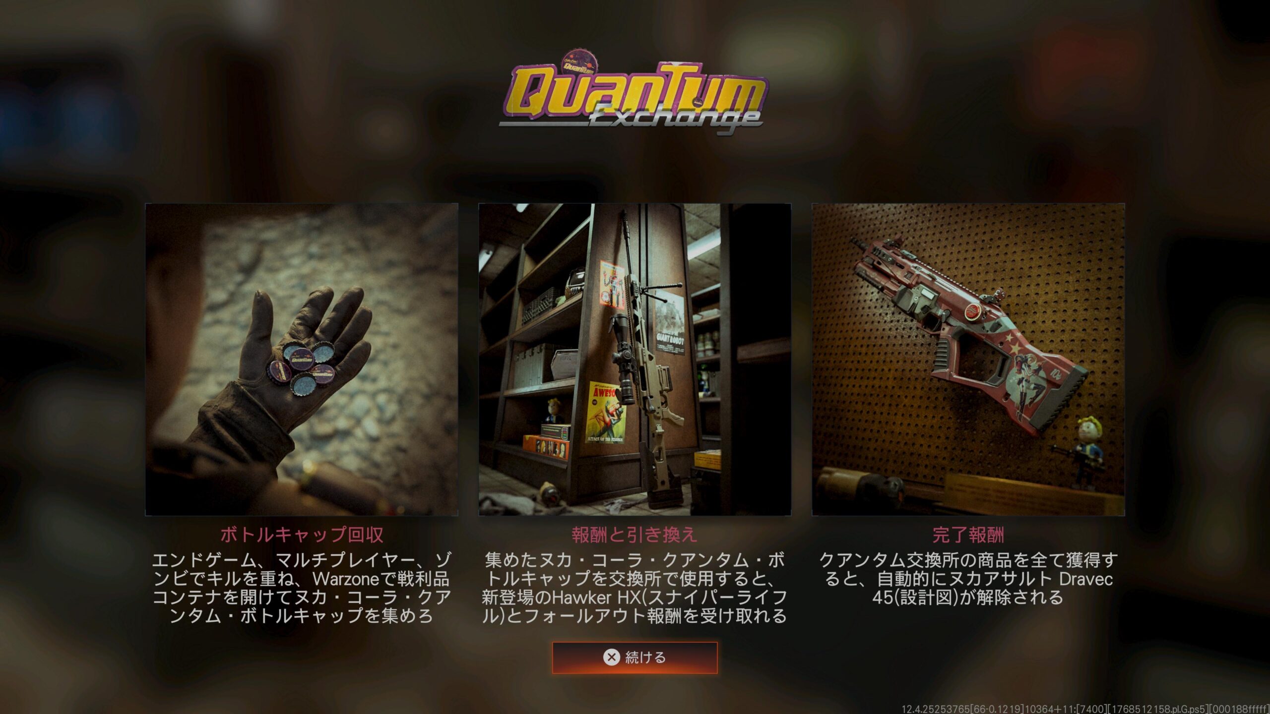 「フォールアウト」をテーマとするクアンタム交換所イベントの一環として、全てのモードでボトルキャップを集め、新たなスナイパーライフル「Hawker HX」やSMG「Nuka Assault」の武器設計図をアンロックしよう。