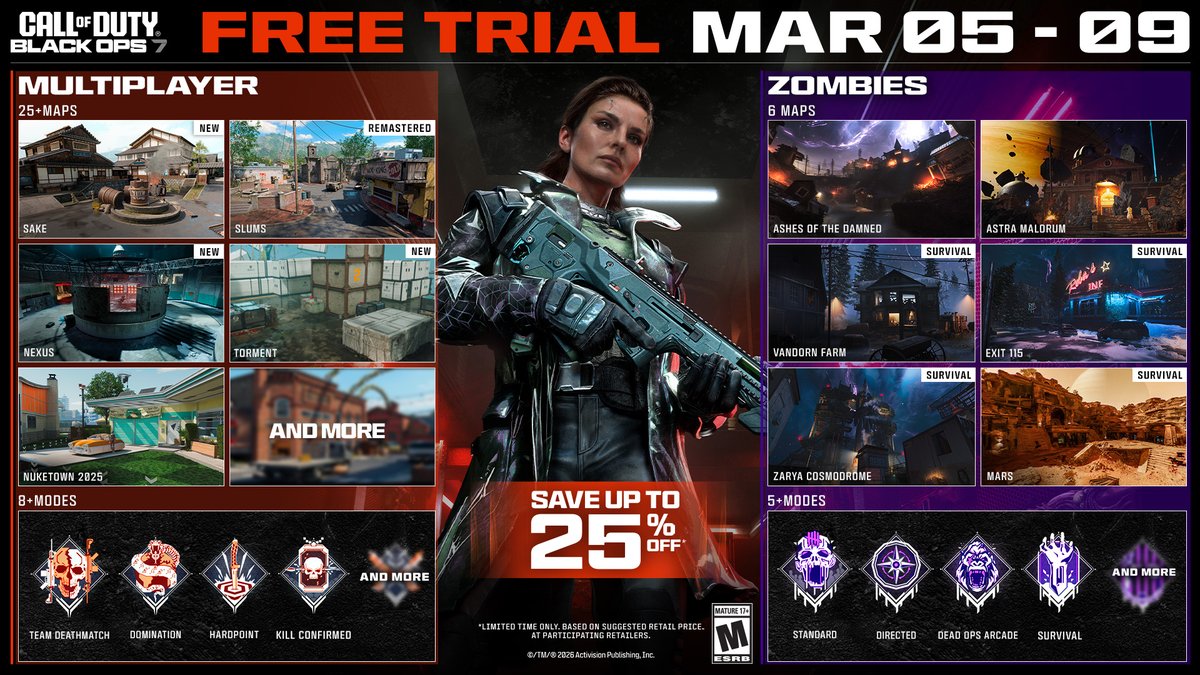 Call of Dutyシリーズの公式Xアカウントが、期間限定の無料トライアルを実施していることを発表した。トライアルでは、シリーズの人気コンテンツを含む多数のマルチプレイヤーマップを体験できる。
