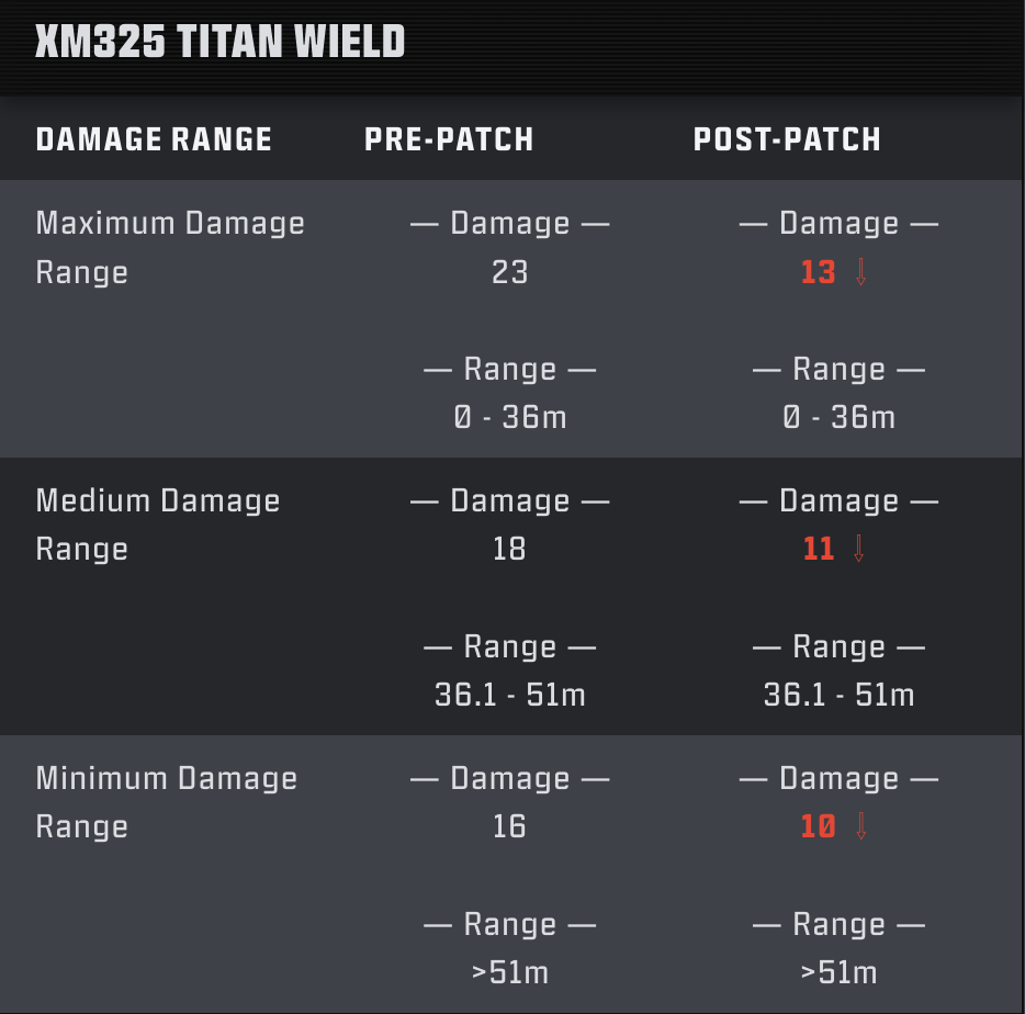 - 私たちは、XM325タイタン・ウィールドの一部の強さを抑えるために、そのダメージに調整を加えています。TTK(キルタイム)は依然として非常に競争力のある水準を維持する予定ですが、遠距離で射撃を外した際に体感できる、より大きなダメージ減衰が発生するようになります。私たちは、プレステージアタッチメントと組み合わせることで成立する「タレット」ビルドの実用性を維持するため、拡散(スプレッド)を弱体化させるのではなく、この方法を意図的に選択しました。さらに本武器を他の対スコアストリーク用ビルドとより足並みを揃えるため、スコアストリークに対するダメージについても、追加のピンポイントな調整を行う予定です。