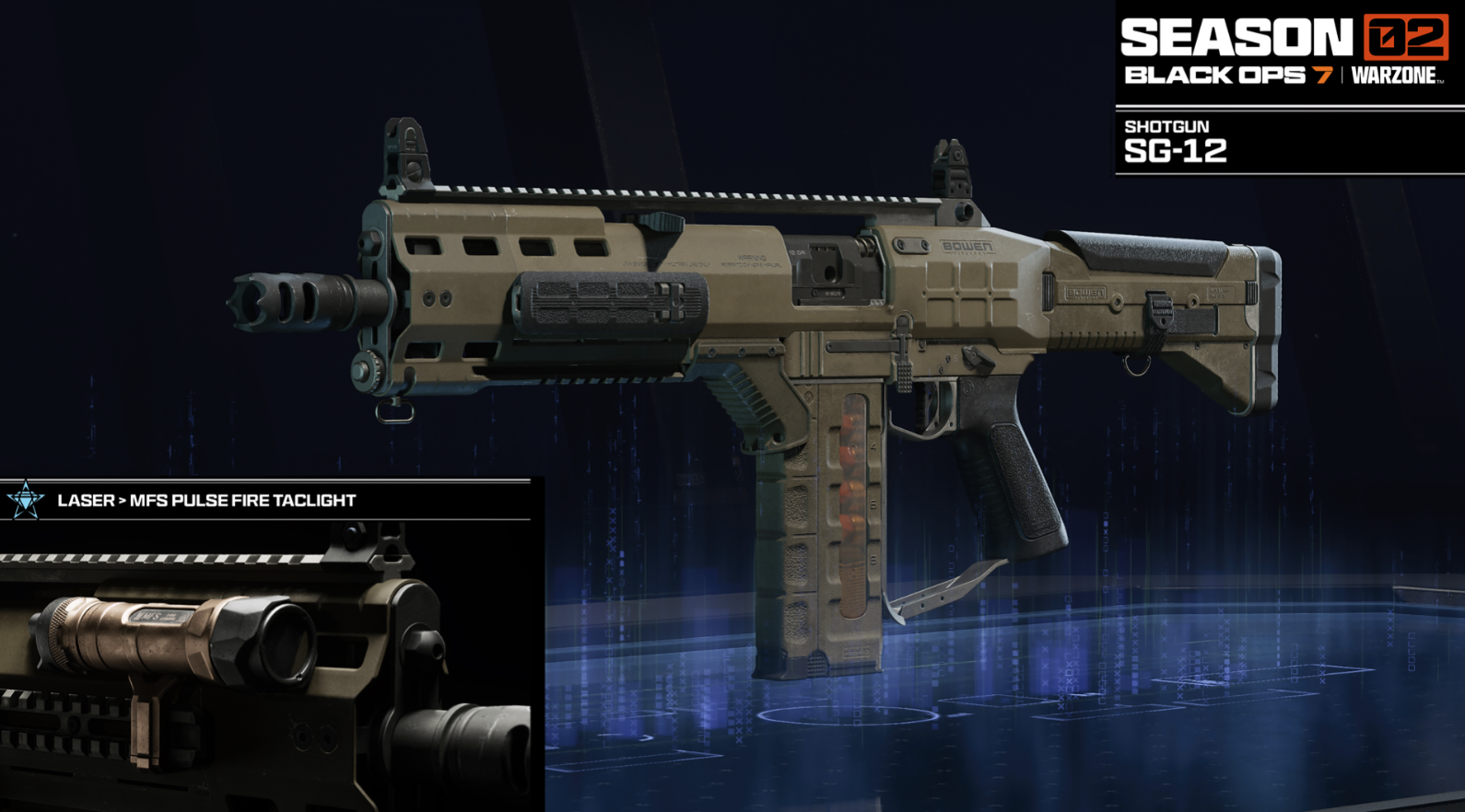 SG-12で敵オペレーターをなぎ倒せ。現在利用可能な他のセミオートショットガンと比べてはるかに高い連射速度を誇り、さらに同クラスで最長の有効ダメージ射程を備えている。マガジン容量は8発で、素早い連続射撃により敵を叩き込める一方、他のショットガンと比べて総合的なダメージ量は低めに抑えられている。