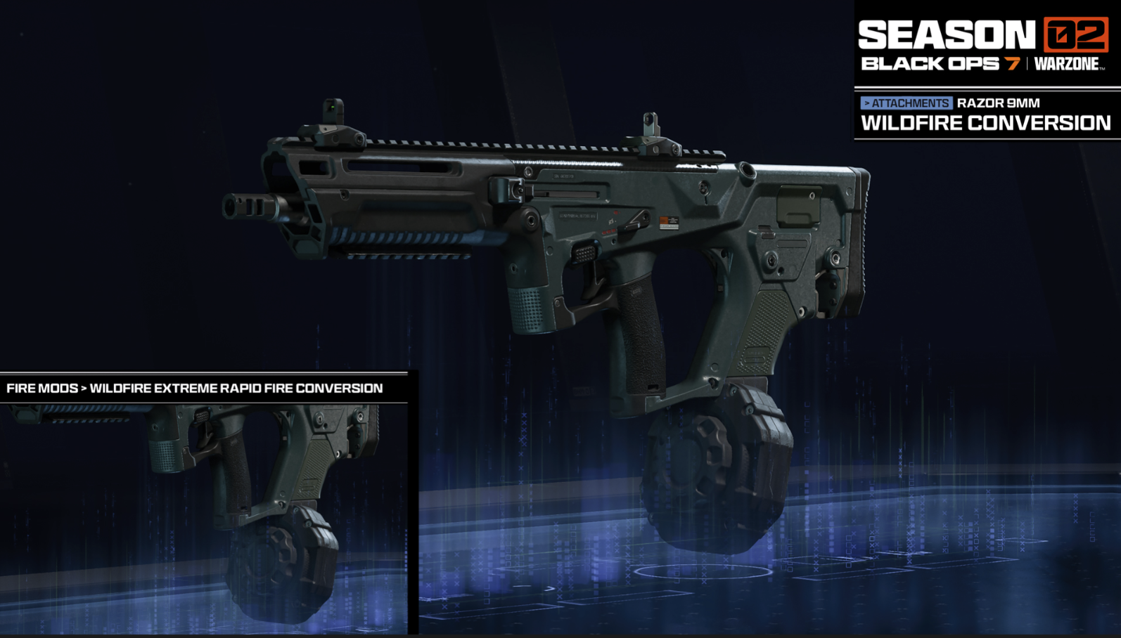 フルオートのサブマシンガン。極めて高速な連射速度を誇る。折りたたみ式/展開式ストックを切り替えることで、ハンドリングと反動特性が変化する。