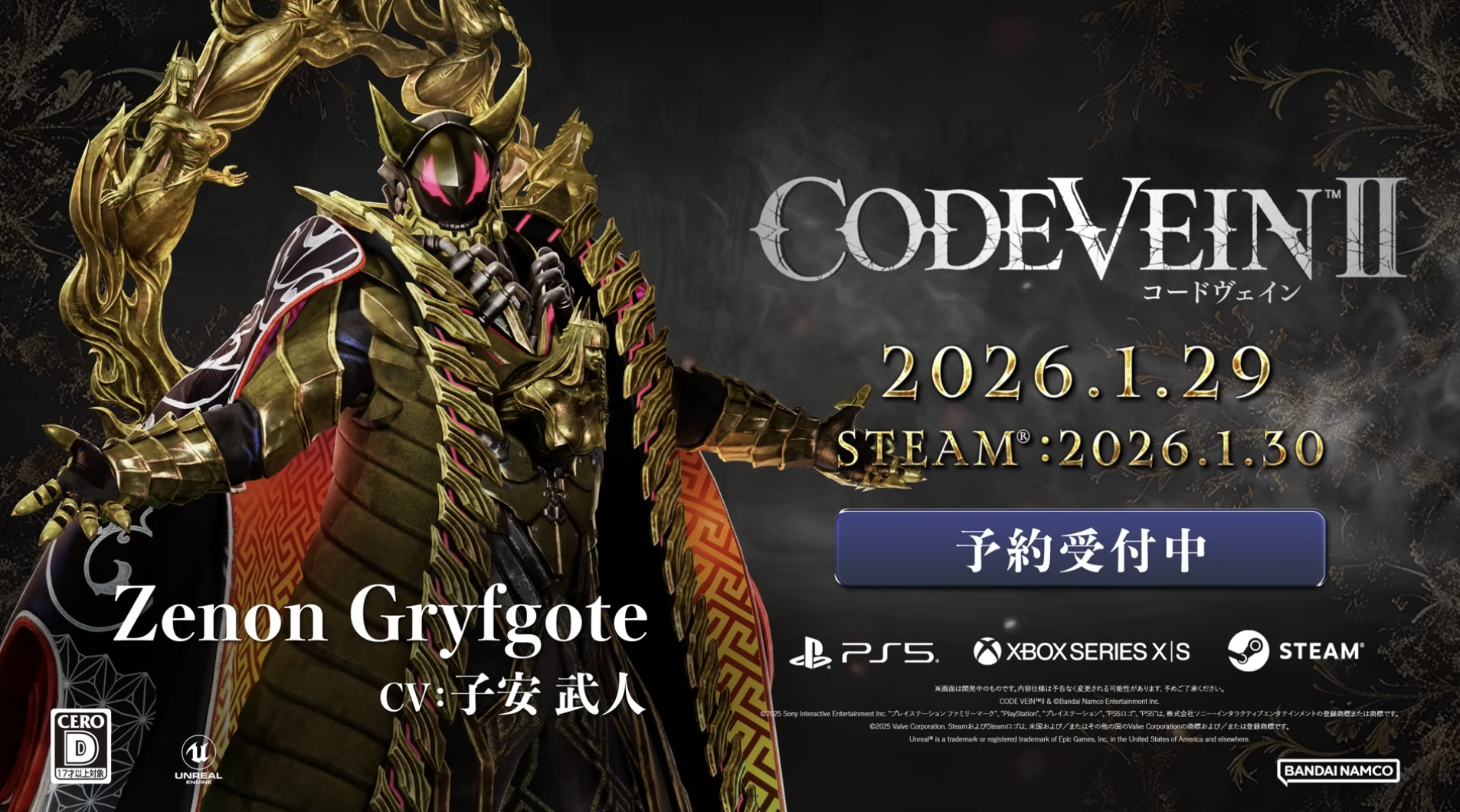 バンダイナムコエンターテインメントは、アクションRPG『コードヴェイン2(CODE VEIN II)』に登場する新キャラクター「ゼノン・グリフゴート(CV:子安 武人さん)」の最新映像を公開した。
