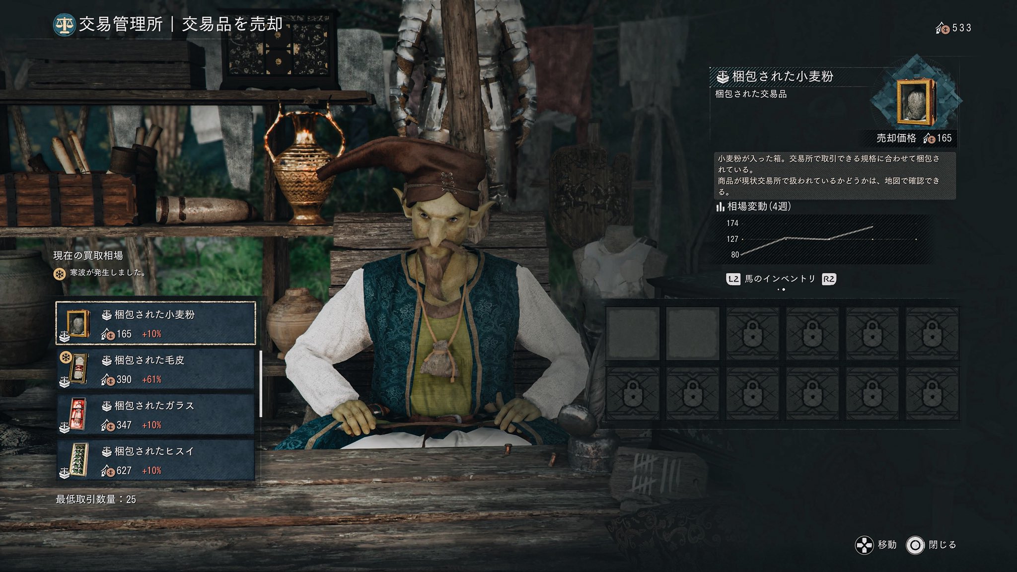 王室交易は馬に担がせてそのまま乗っていけば買い取るけど普通の公益はその場所ごとに買い取れるものが決まってんだよな