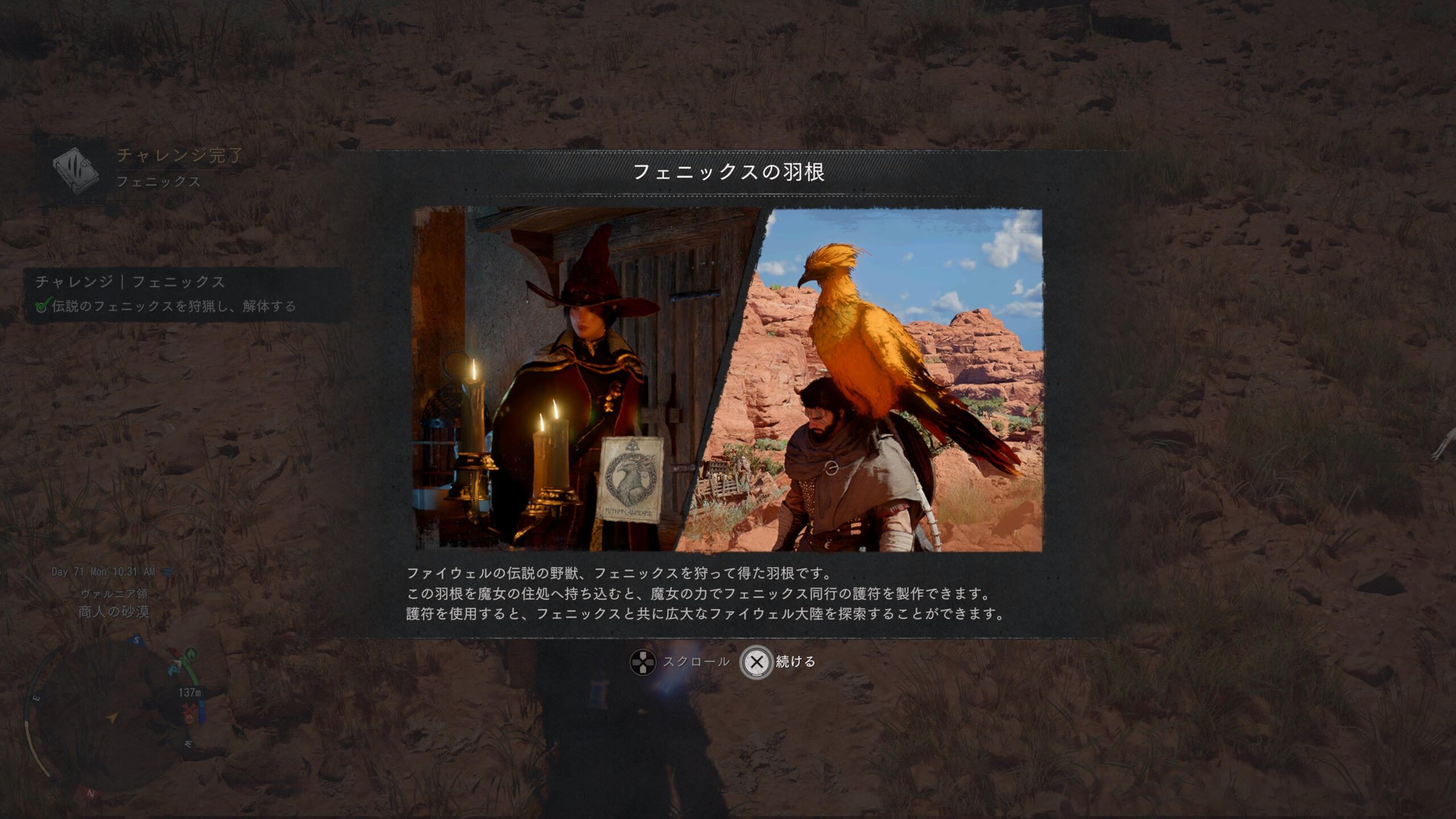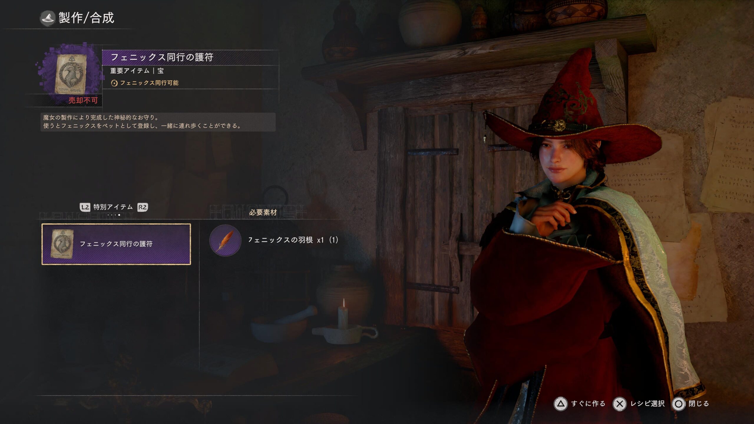 魔女の家に行き製作・フェニックス同行の護符を作成する。