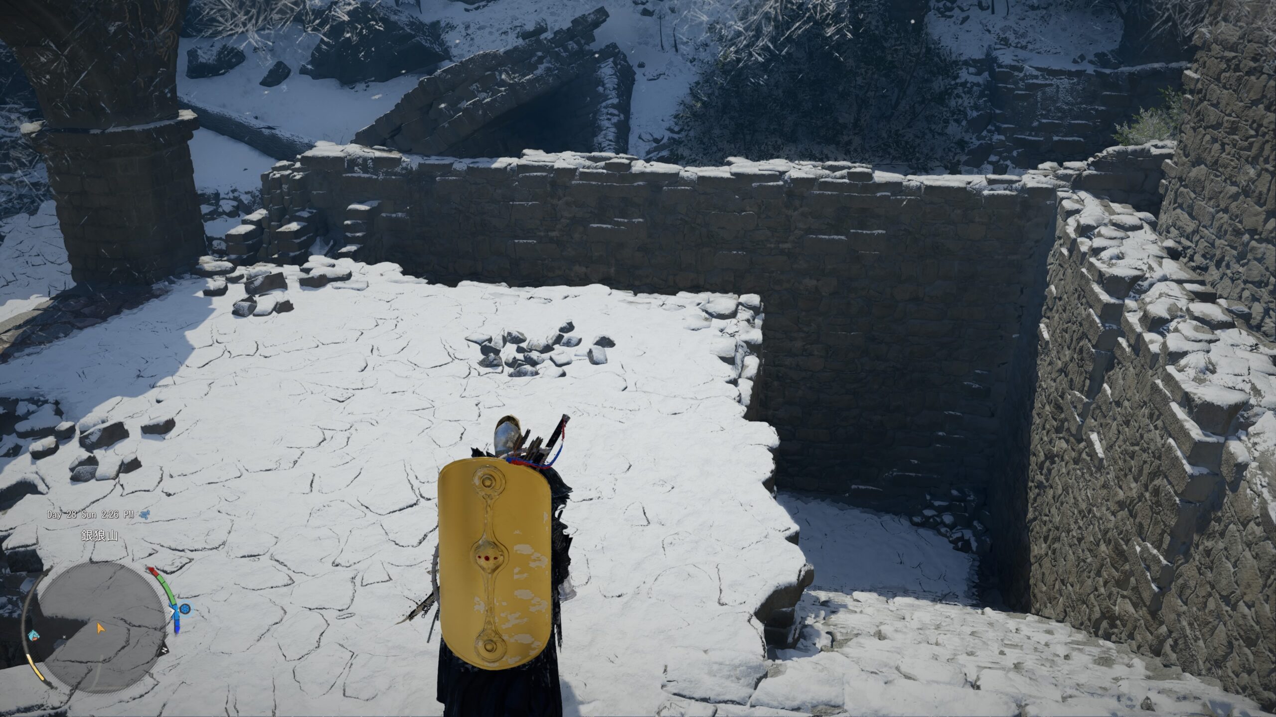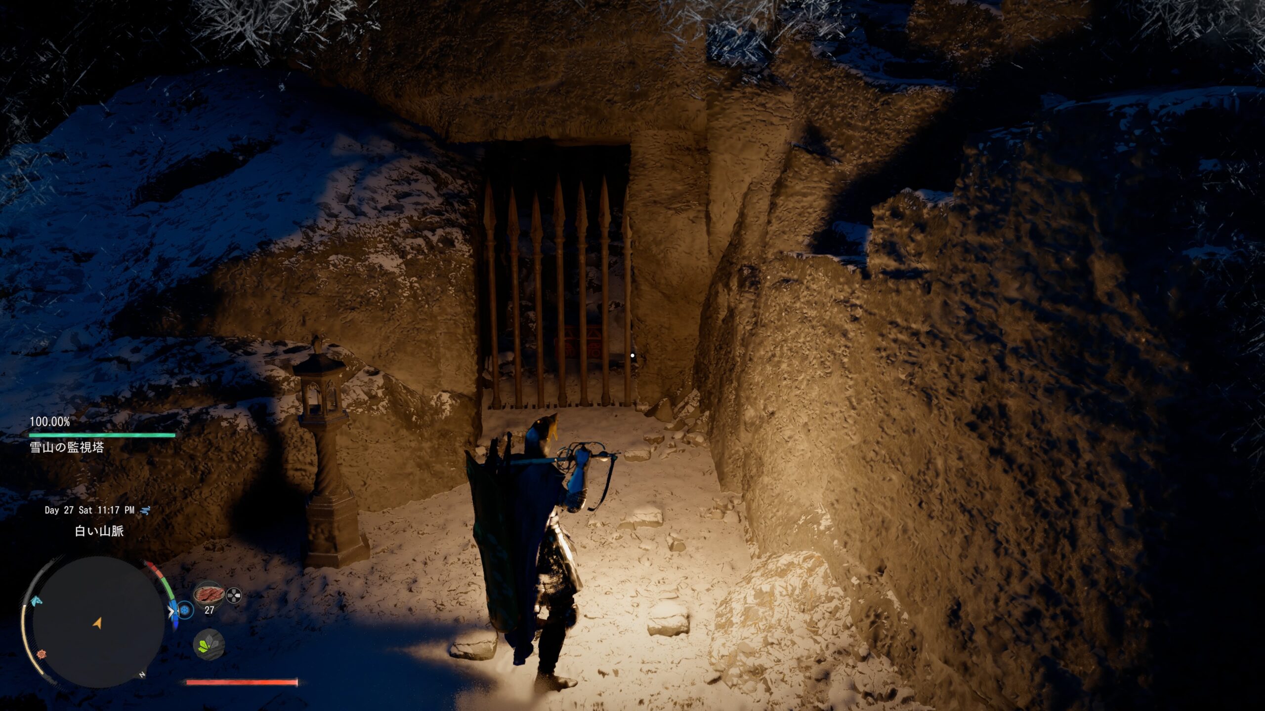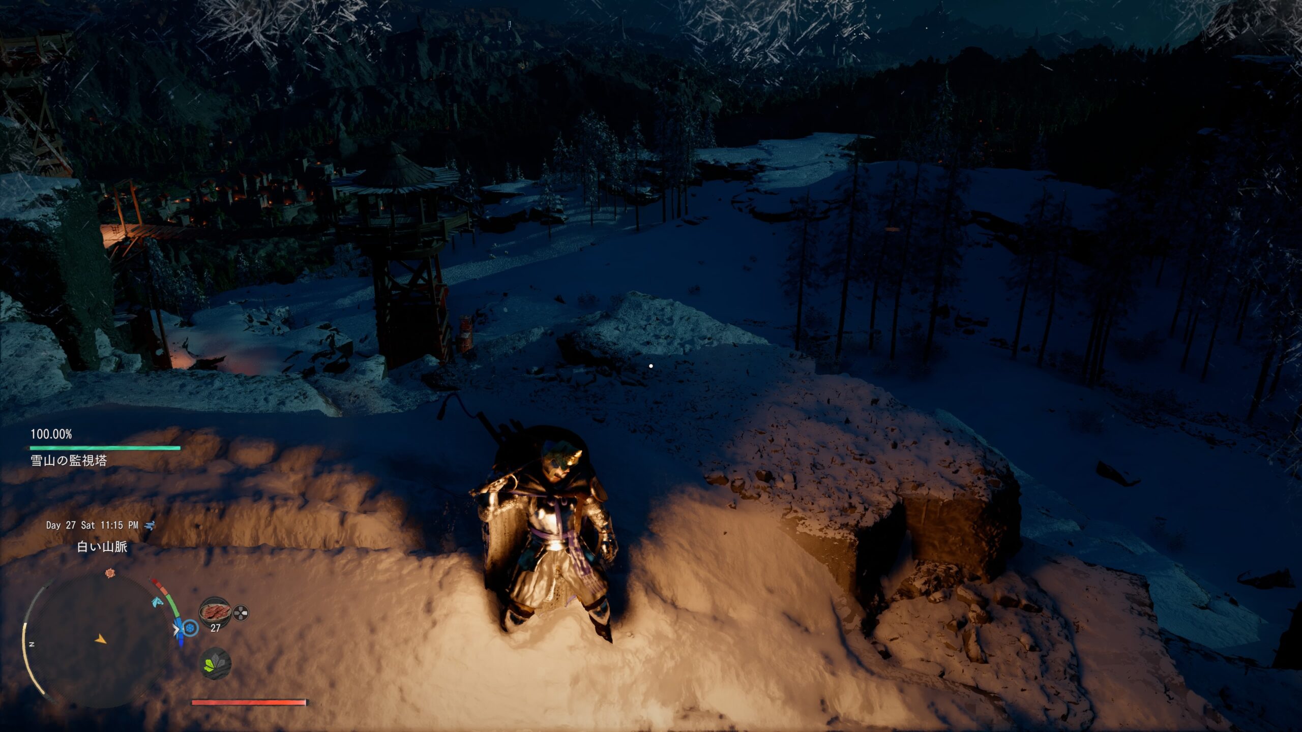雪山の監視塔のやや左下辺り。