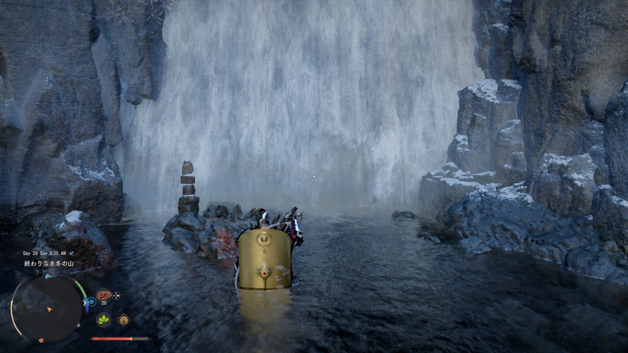 滝の前で突き攻撃(R1+🔼)で中に入れます。