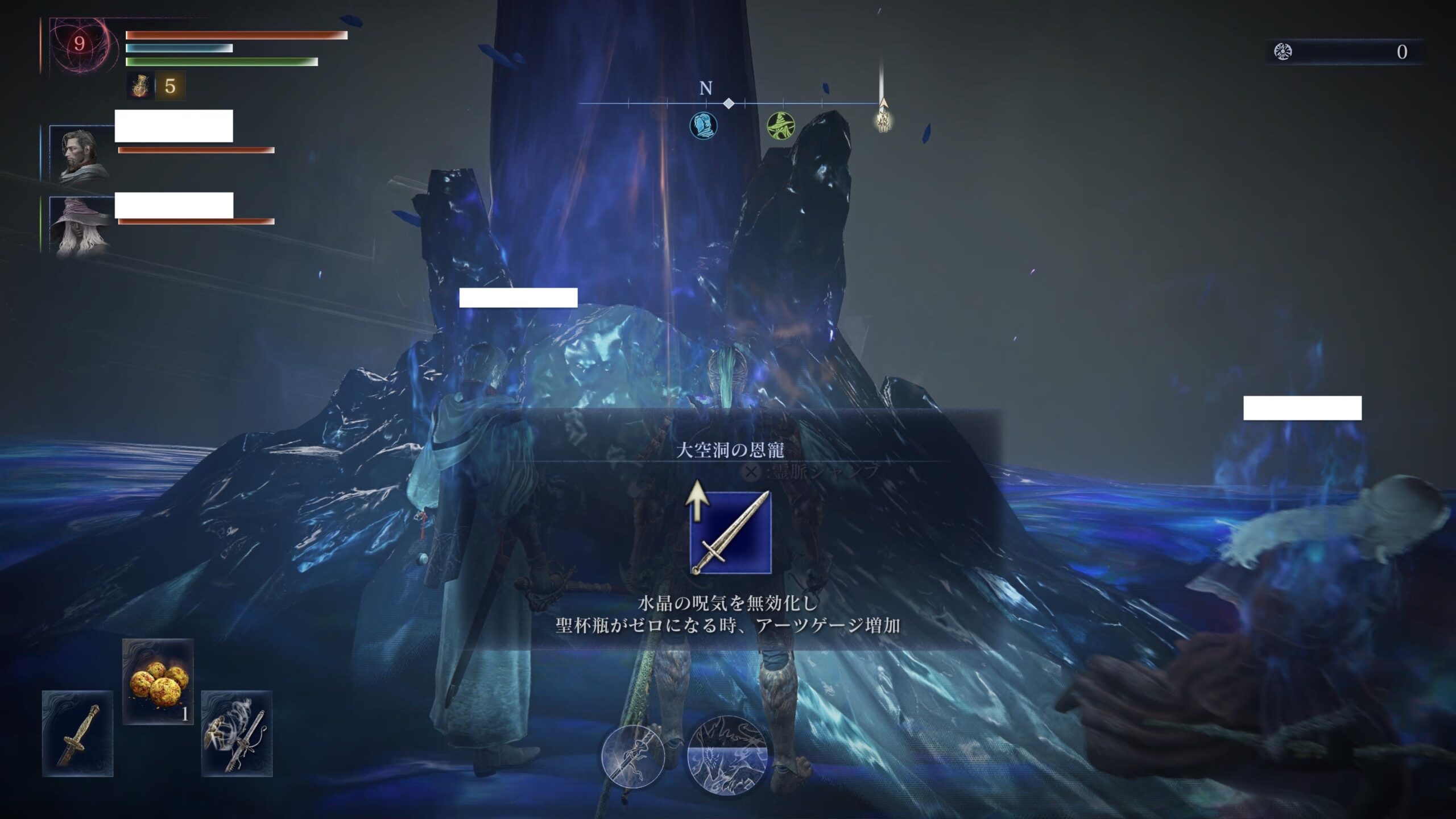 二日目に入ると地図上に大結晶の場所が表示されるので3箇所を共鳴(破壊)すると別の場所で恩寵を入手できます。
