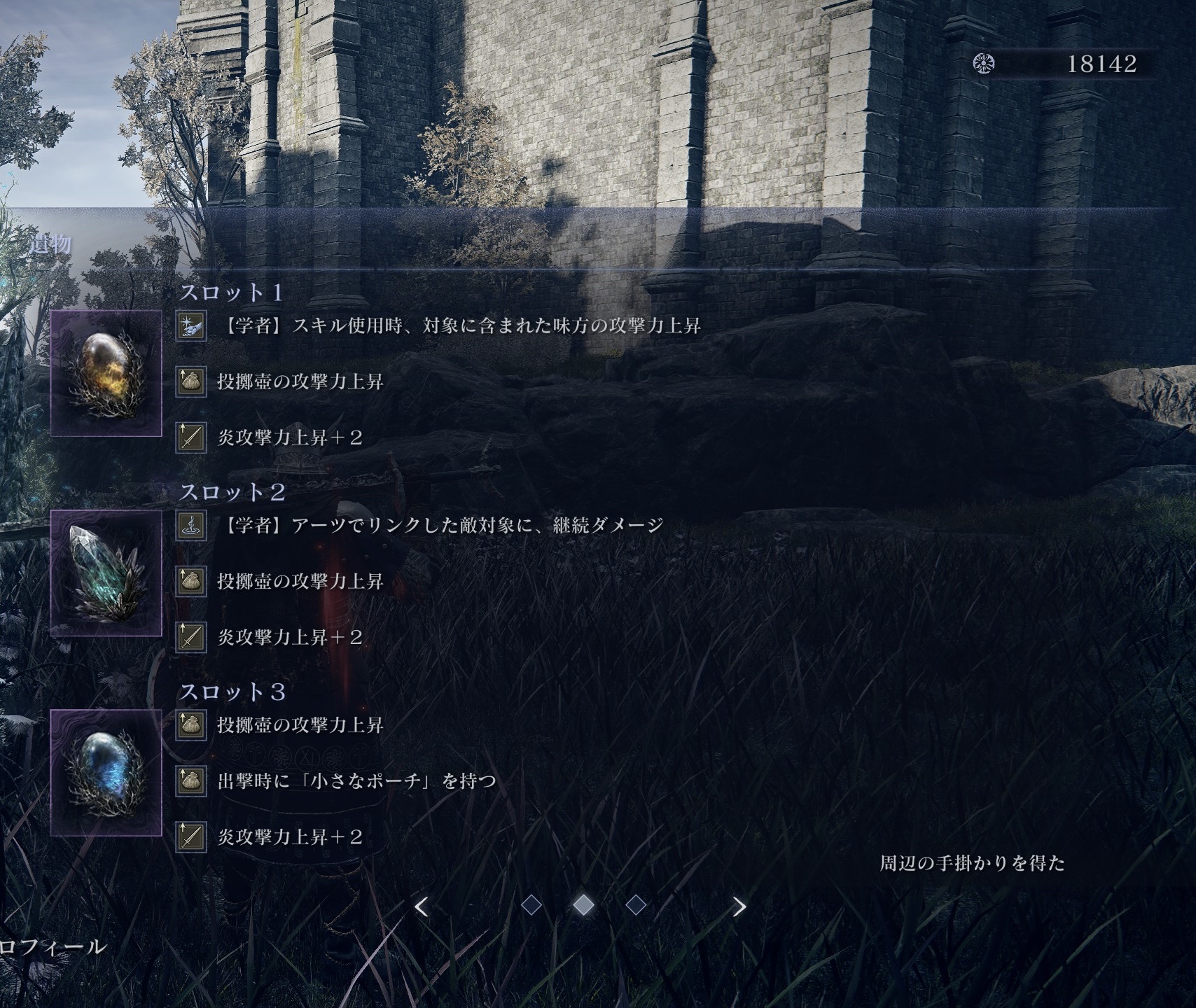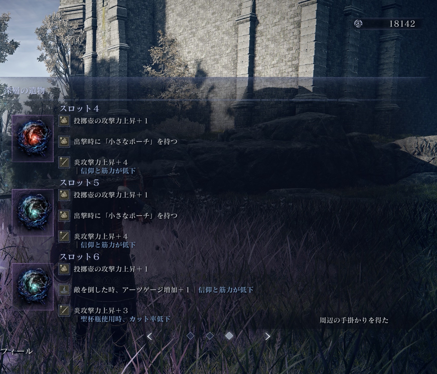 『ナイトレインDLC』学者壺ビルドの無駄のない遺物構成とゲージ維持が主体のぬくもり石×3。
