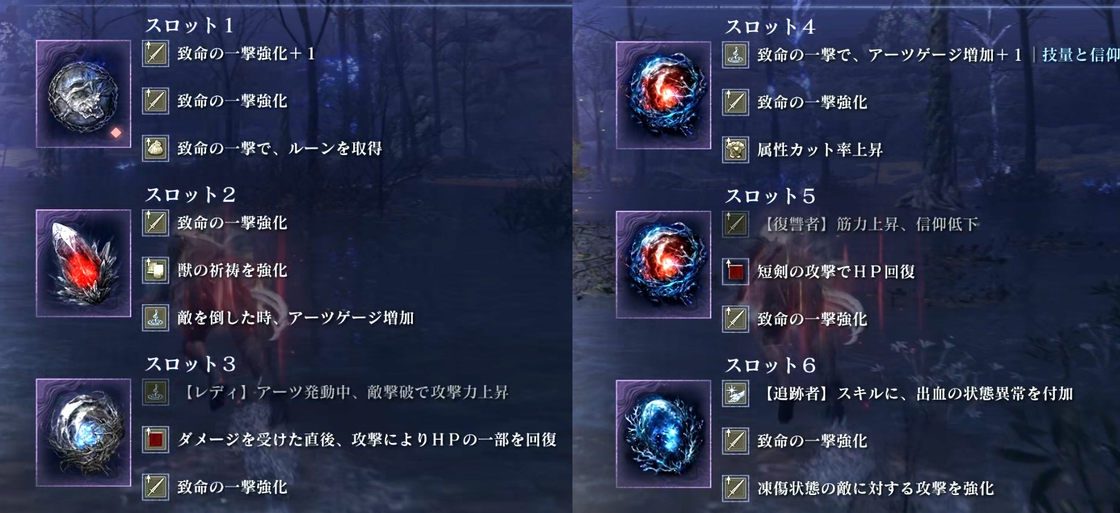 『ナイトレイン』①追跡者 致命特化ビルドの遺物構成②ハルモニア深層遺物 物理+12と属性攻撃+6の比較。