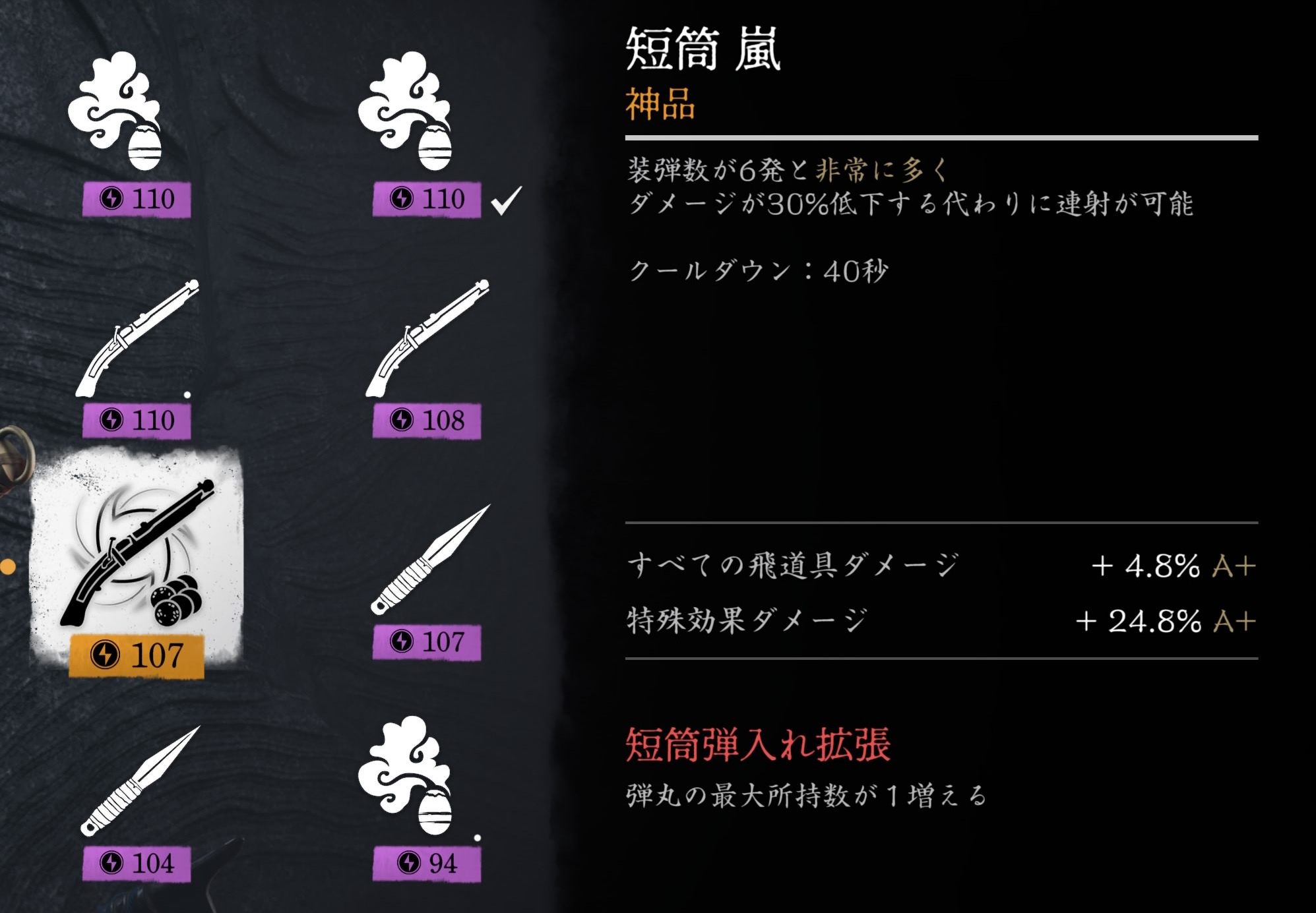 単筒 嵐 装弾数6、連射可、ダメージ30%減