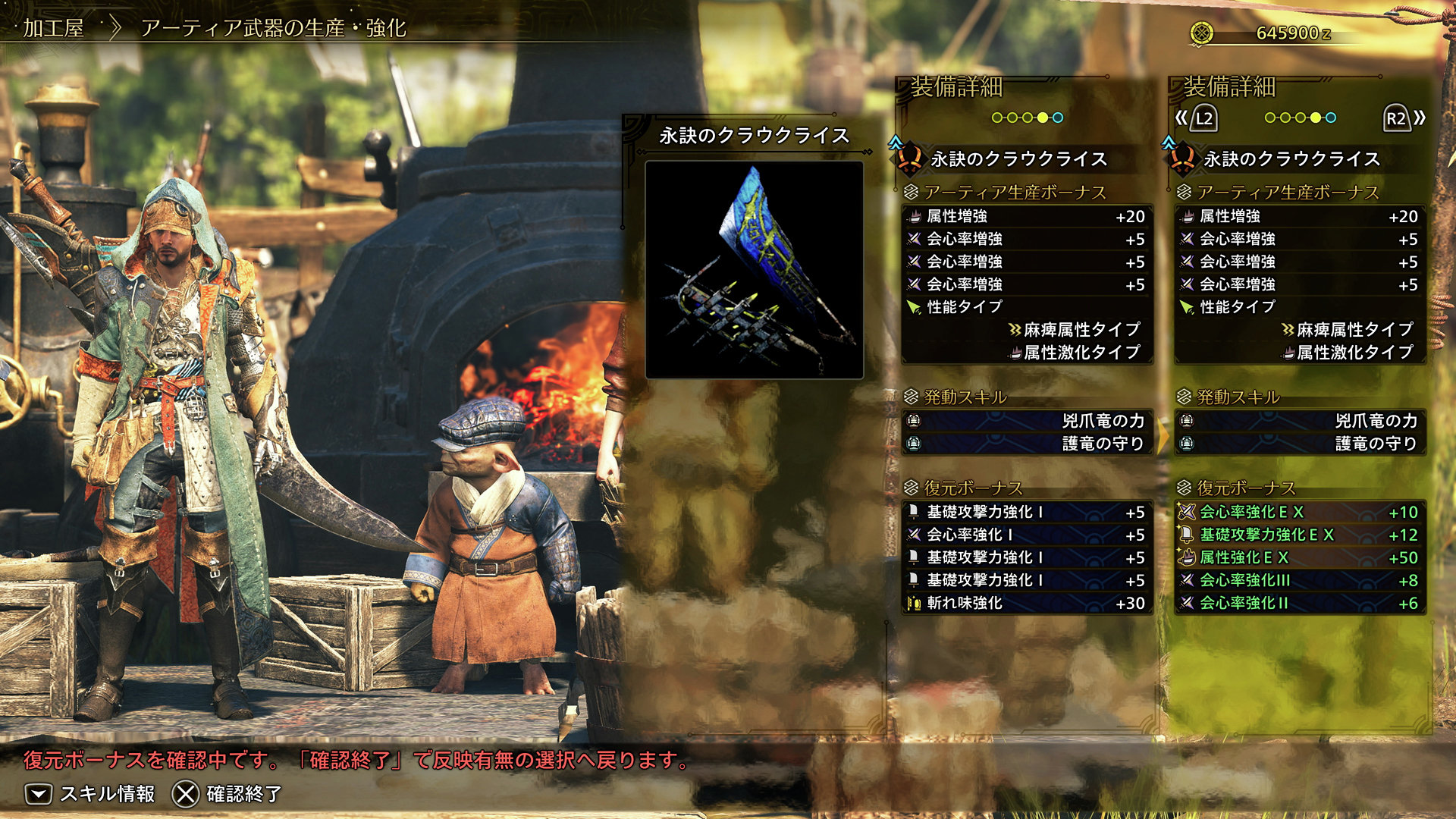 復元ボーナスの強化ってⅡ、Ⅲ、EXになるけれど、各ステータス(攻撃、会心、属性)でEXを付けられるのは1つずつって予想もあるみたいね