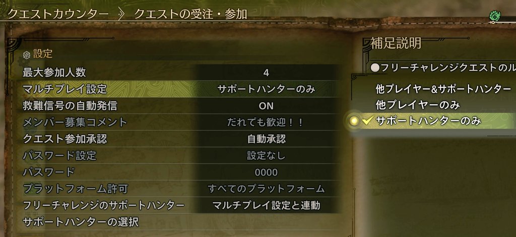 マルチプレイ設定を「最大人数4」「サポートハンターのみ」にし救難信号の自動発信をオンにする