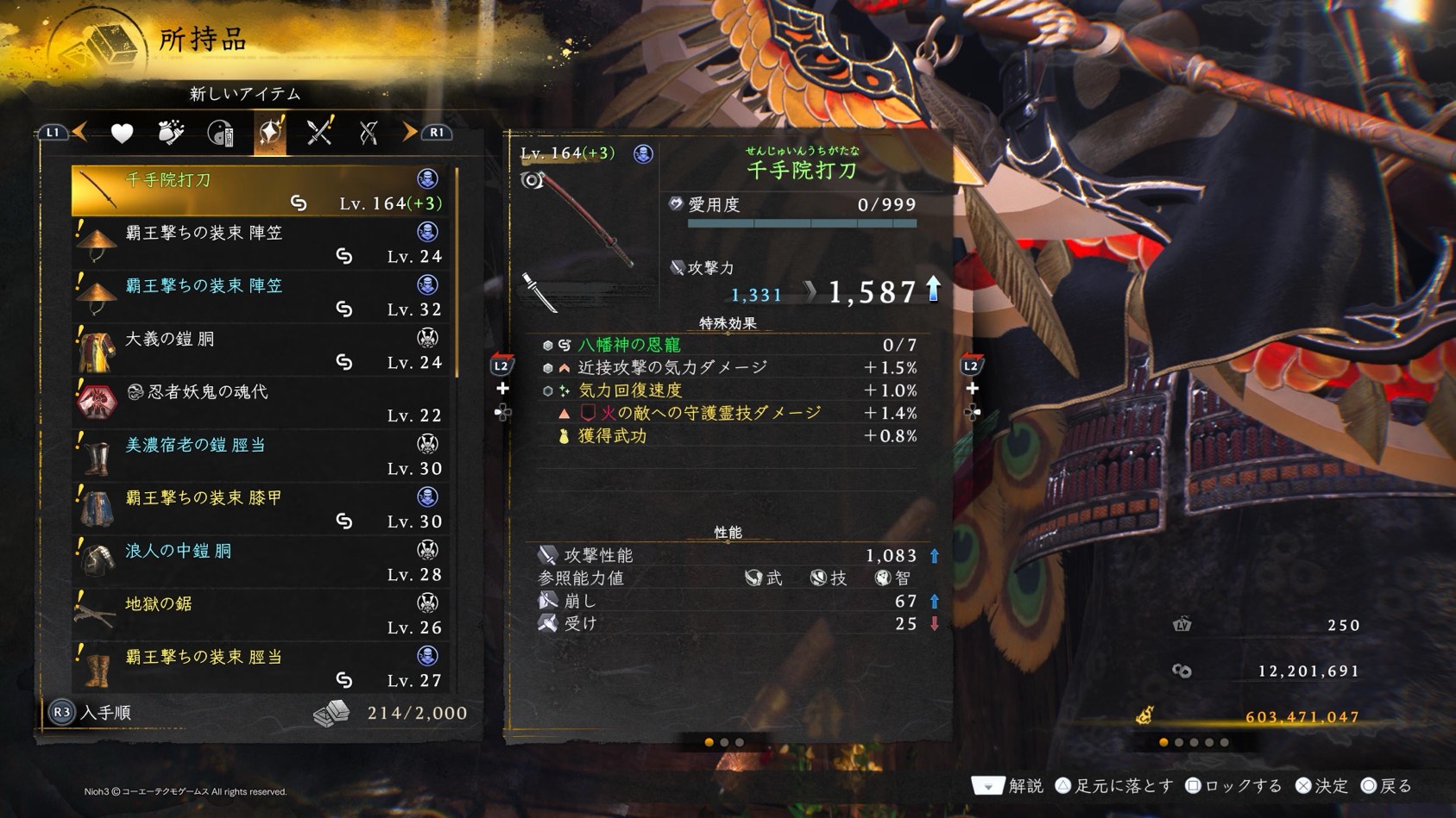 憶測の域だけど、もしかして装備してる防具160(+15)とかにして幸運上げると出やすいとかあるのかも。。#仁王3 pic.twitter.com/YrVPUr5FkC