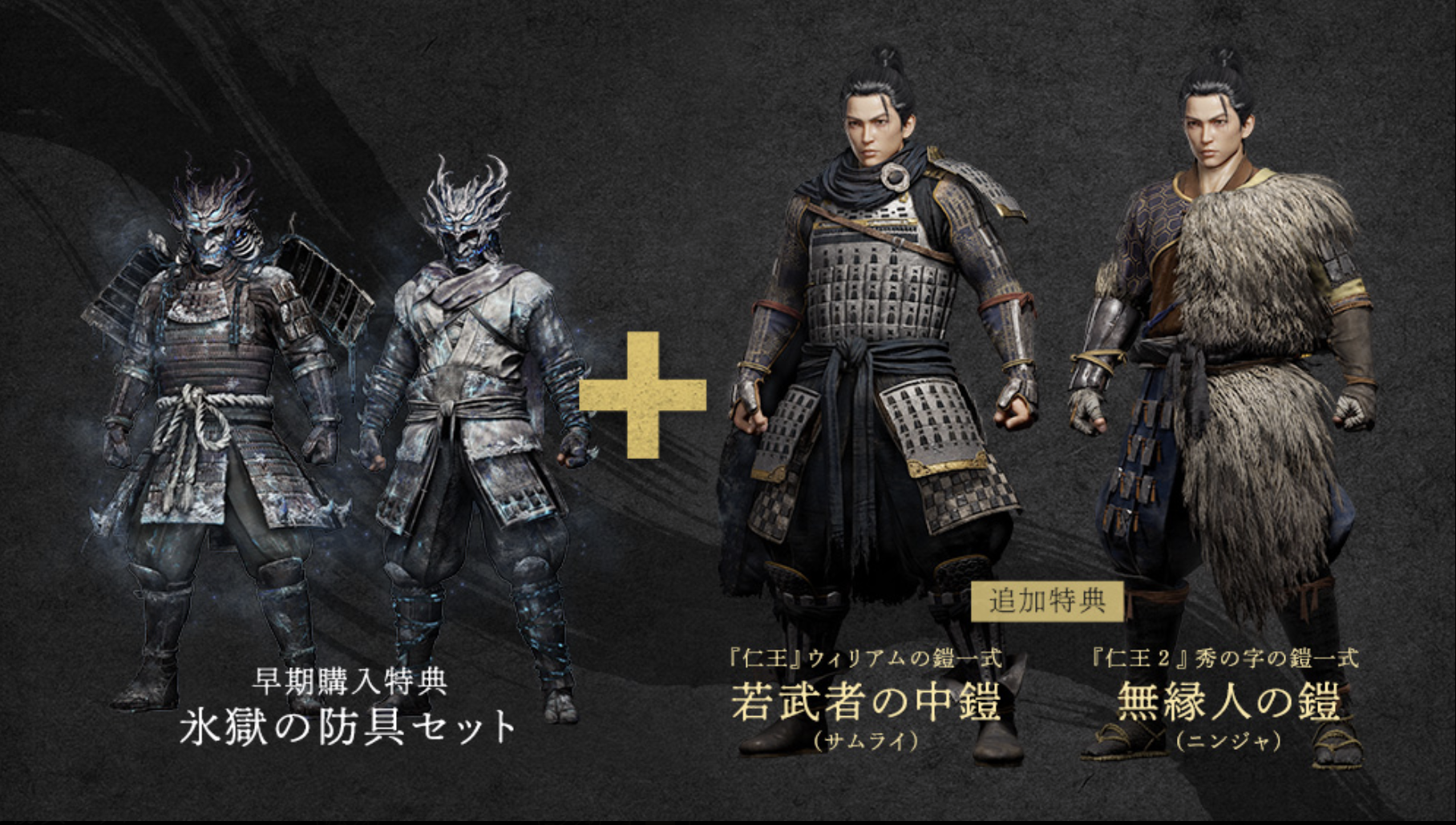 早期購入特典をお持ちのプレイヤーの方を対象に、 『仁王』主人公・ウィリアムと『仁王2』主人公・秀の字の鎧を追加。