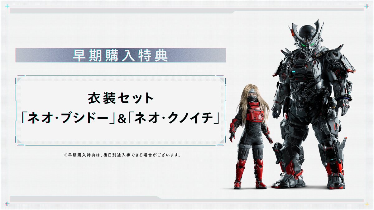 『プラグマタ』のパッケージ版、ダウンロード版ともに早期購入特典として勇猛果敢な戦国時代の武士の衣装を纏ったヒューの衣装「ネオ・ブシドー」と、可憐に暗躍する忍者をテーマにしたディアナの衣装「ネオ・クノイチ」をプレゼント! ぜひ予約して手に入れてください。
