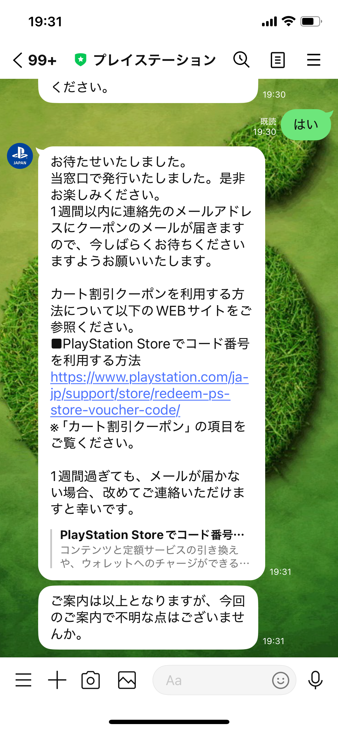 LINEで10%OFFクーポンもらってないって言ったらすぐ発行してくれたわ