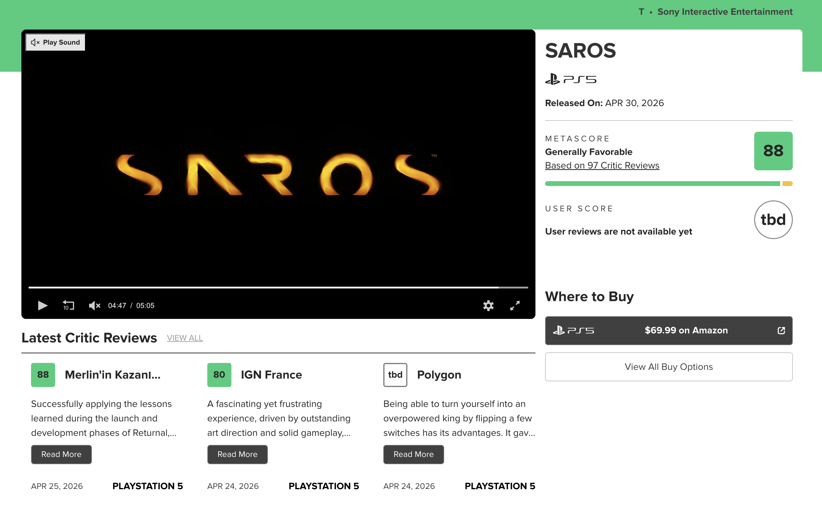 Housemarqueが開発したPlayStation 5独占タイトル『SAROS』 が、海外主要メディアのレビューを集計サイト「メタスコア」で88点を記録しました。発売前レビューで「概ね好評」の評価を得て、2026年発売タイトルの中でもトップクラスの高得点をマークしています。