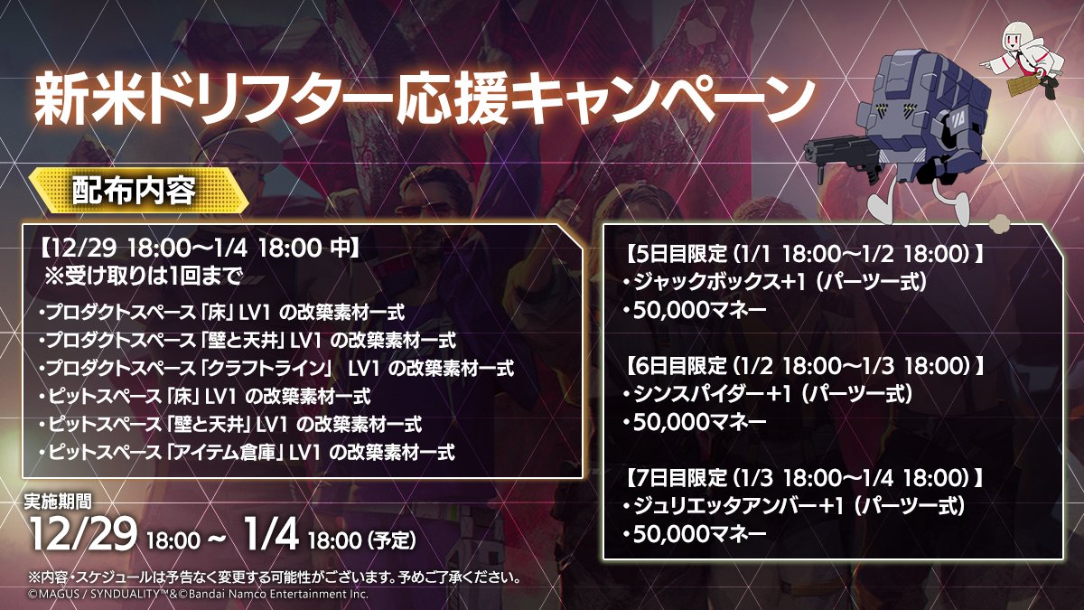 バンダイナムコエンターテインメントは、『SYNDUALITY Echo of Ada』にて、これからゲームを始めるプレイヤーや始めたばかりのユーザーを対象とした「新米ドリフター応援キャンペーン」を開催している。
